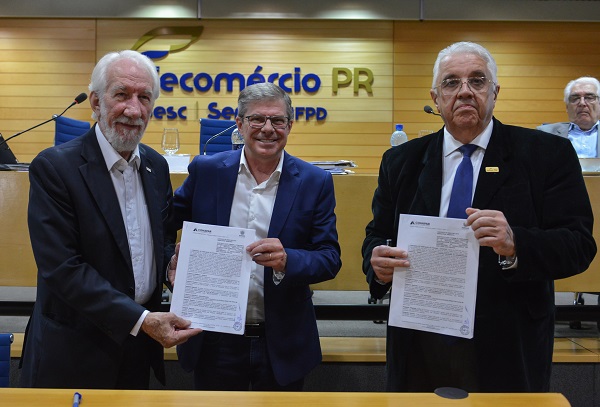 O presidente do Sistema Fecomércio Sesc Senac PR e vice-governador do Paraná, Darci Piana, o diretor-presidente da Cohapar, Jorge Lange, e o diretor regional do Senac PR, Vitor Monastier